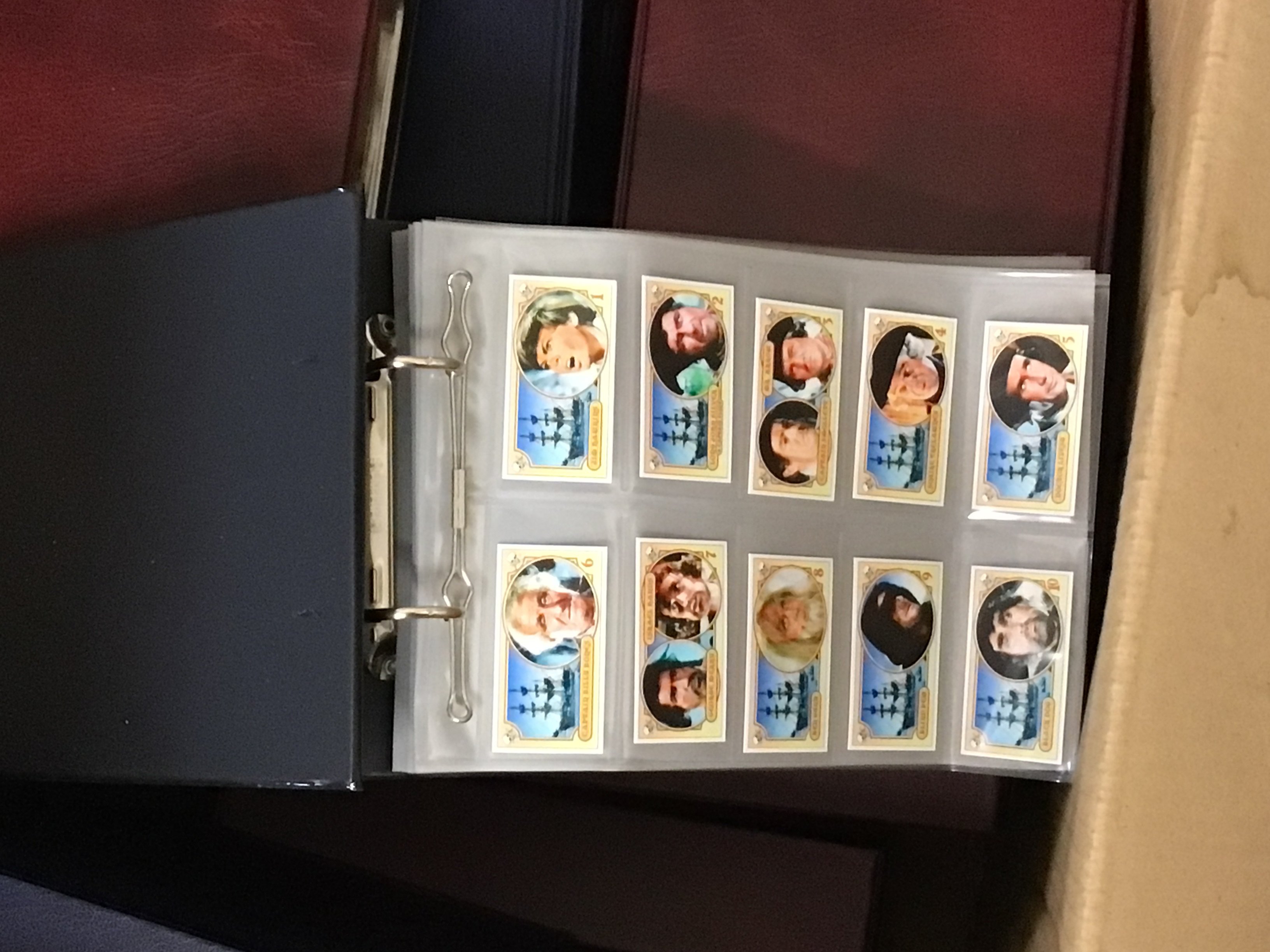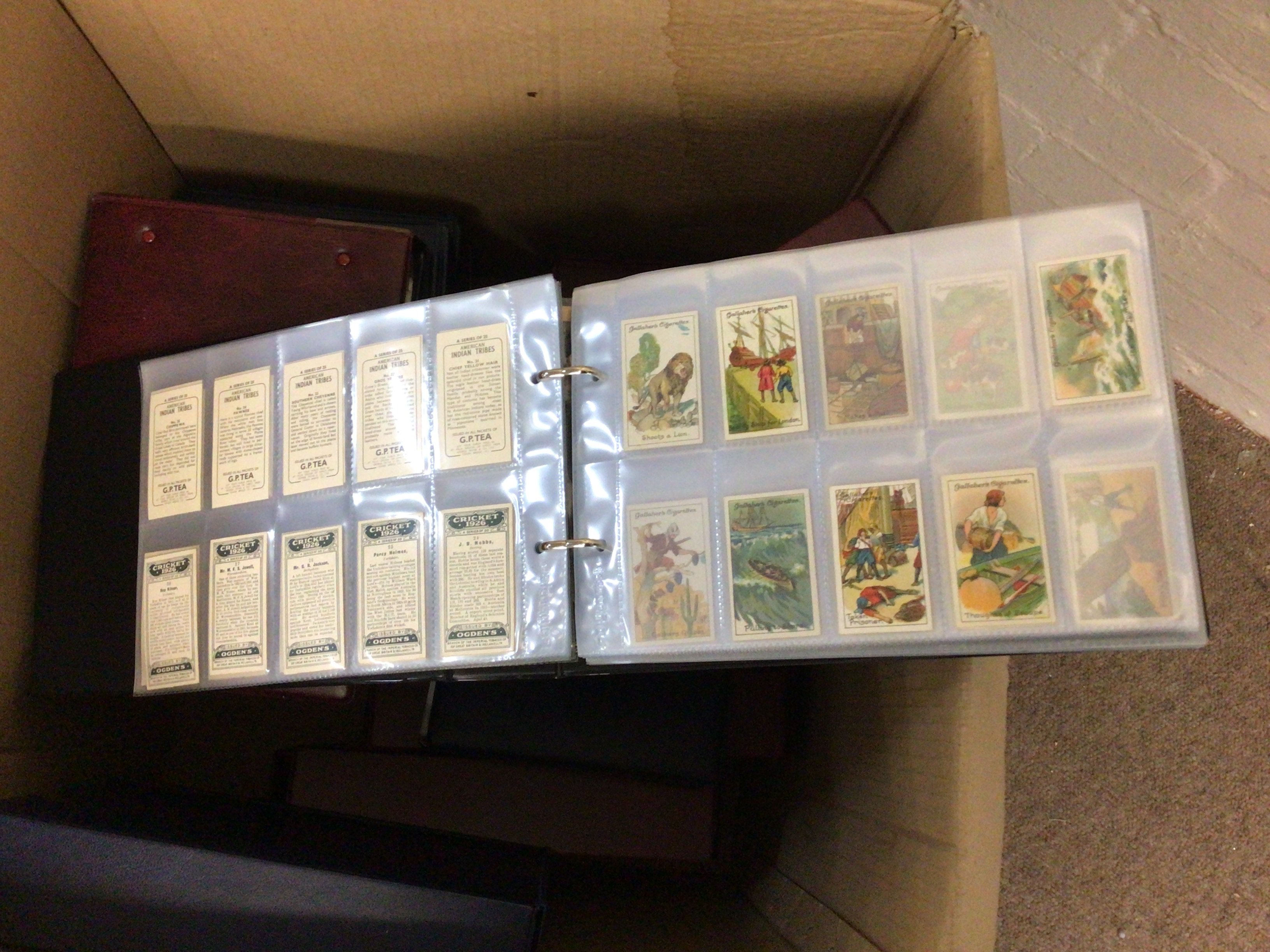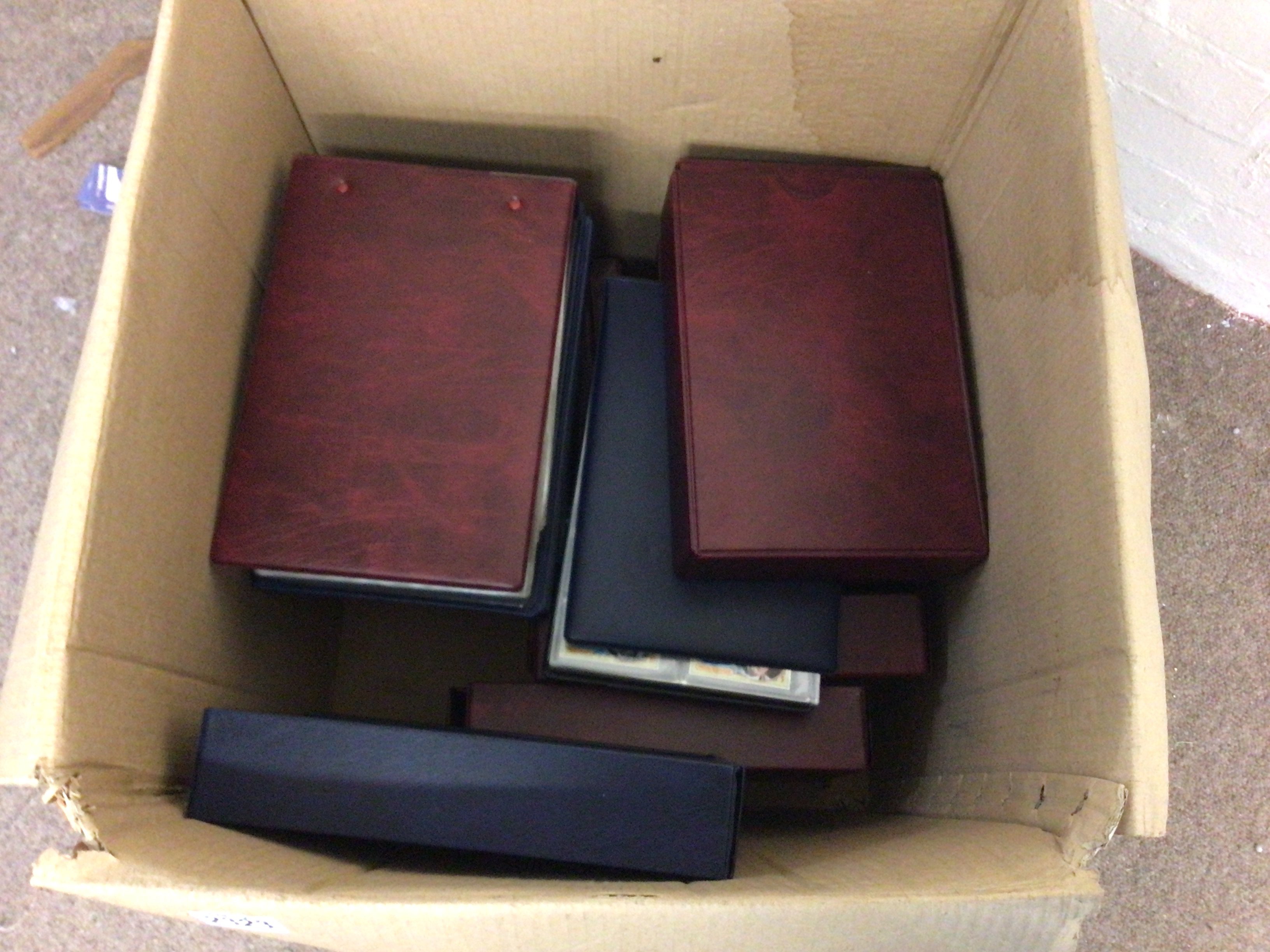 A box containing a collection of albums of postcards and cigarette cards.