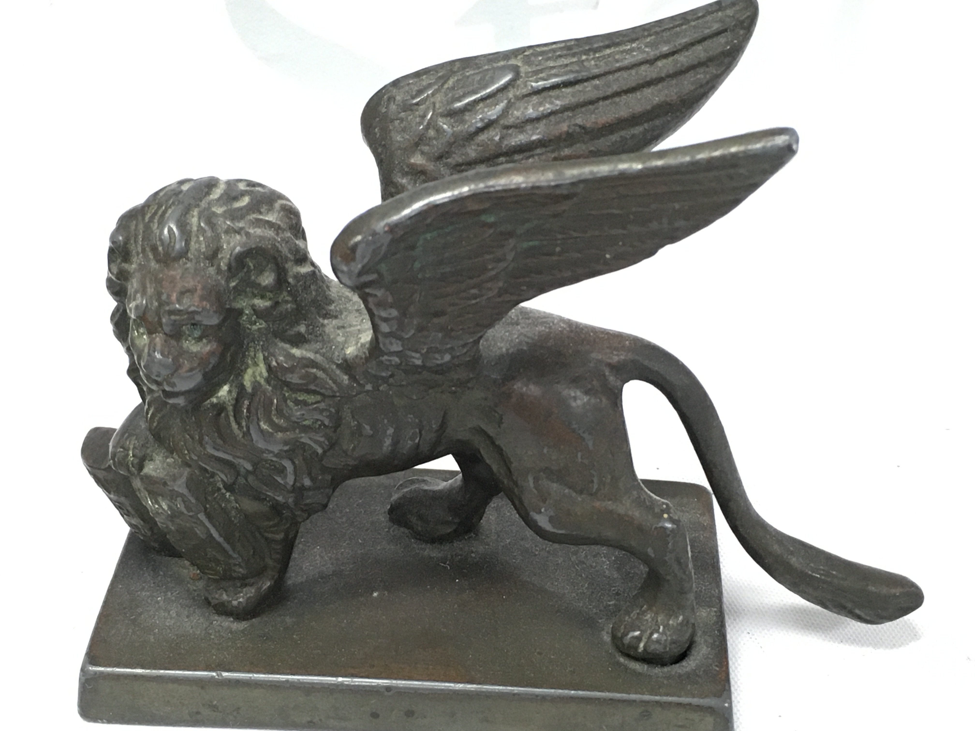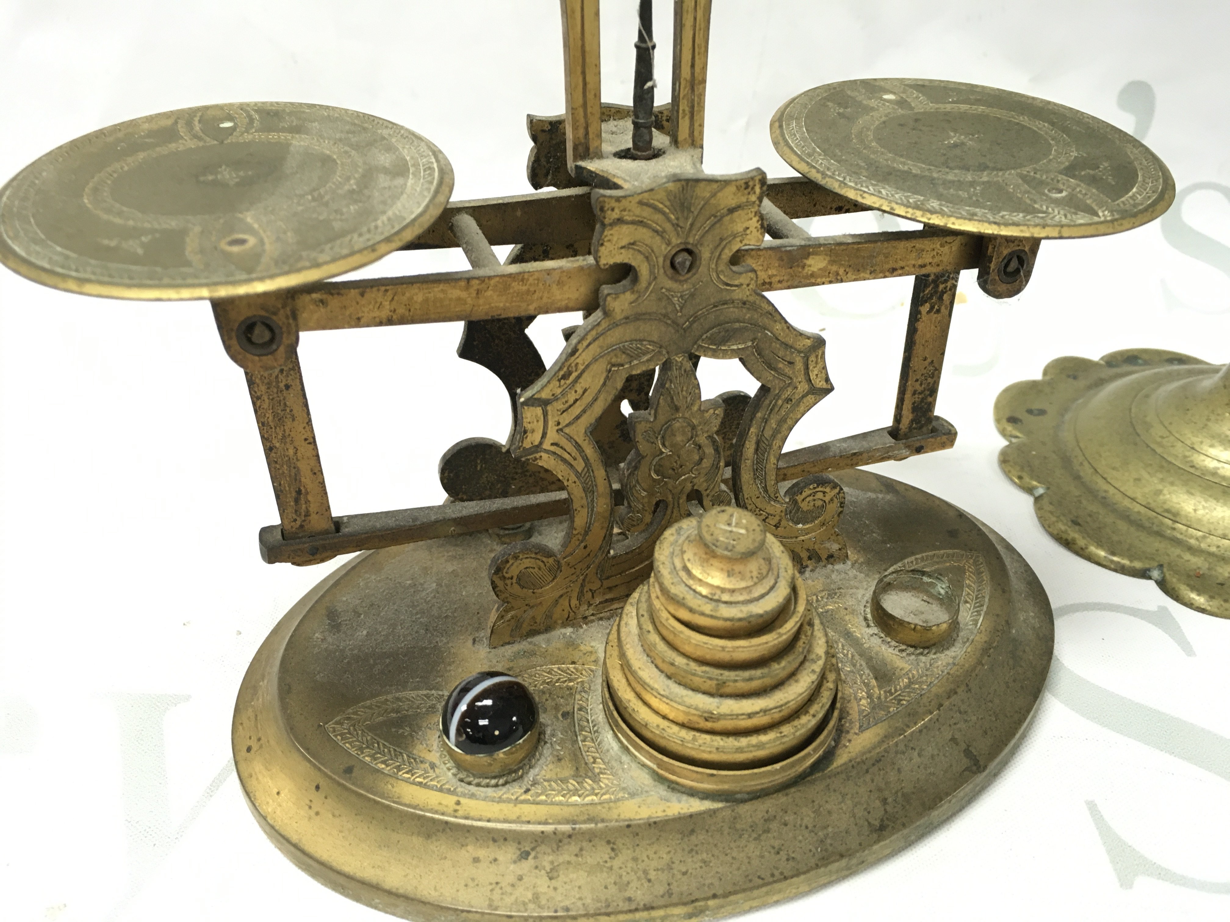 Small set of Victorian scales , small winged lion bronze and a late 18th century brass candle stick . Postage category B