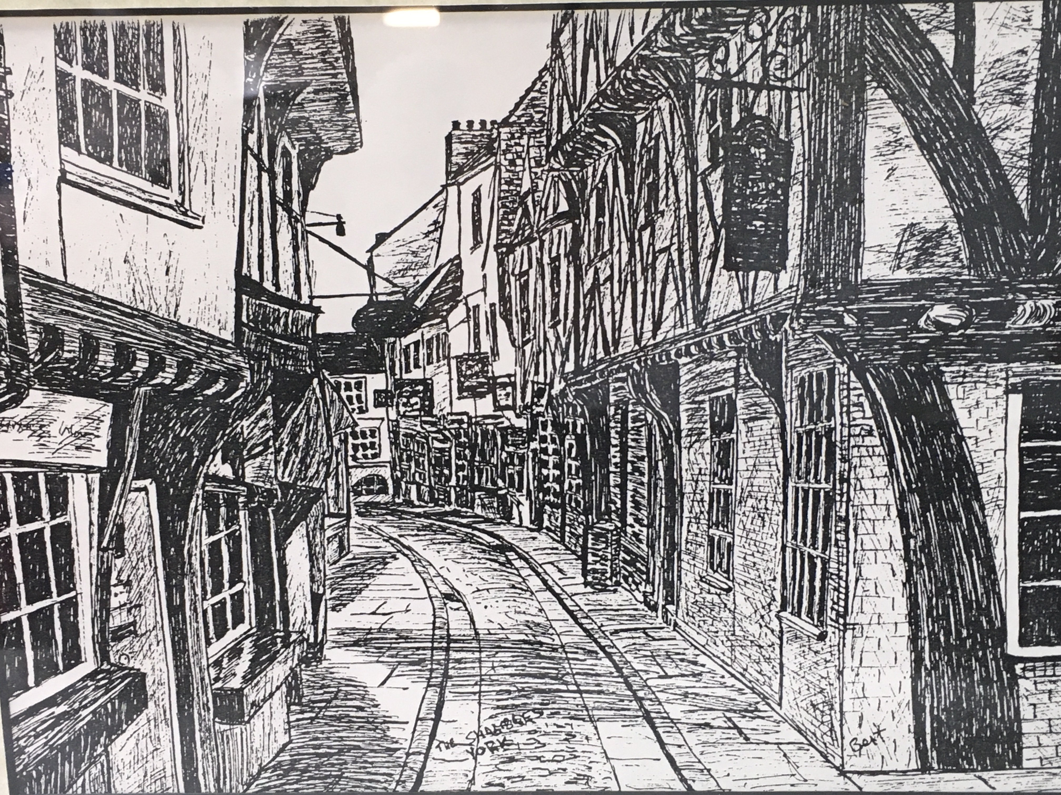 Four cranberry glasses, Framed Edinburgh engraving , From the Carlton Hill and a framed print The Shables in York. This lot cannot be posted