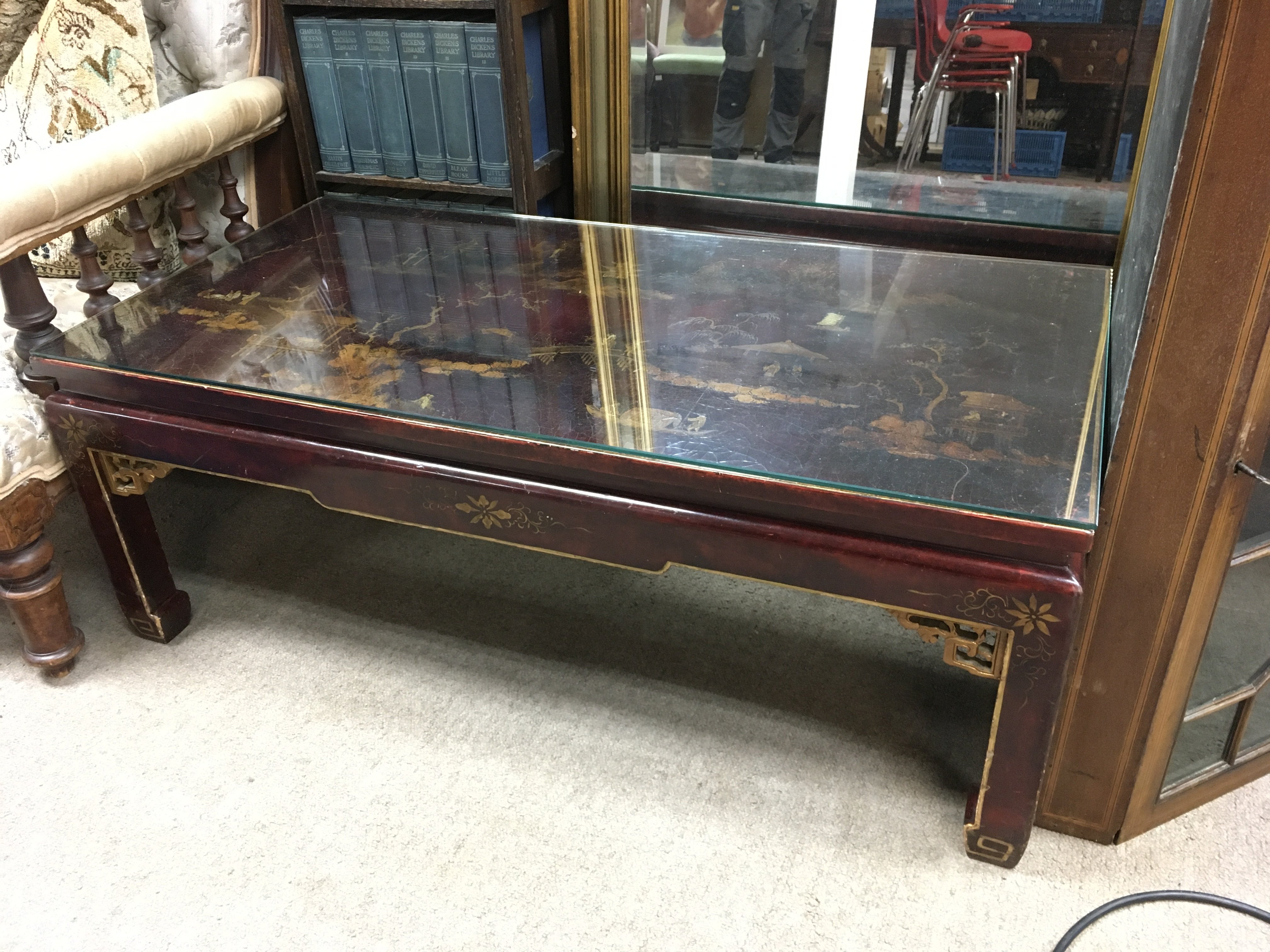A low coffee table with a chinoiserie top, approx length 100cm. Shipping category D.