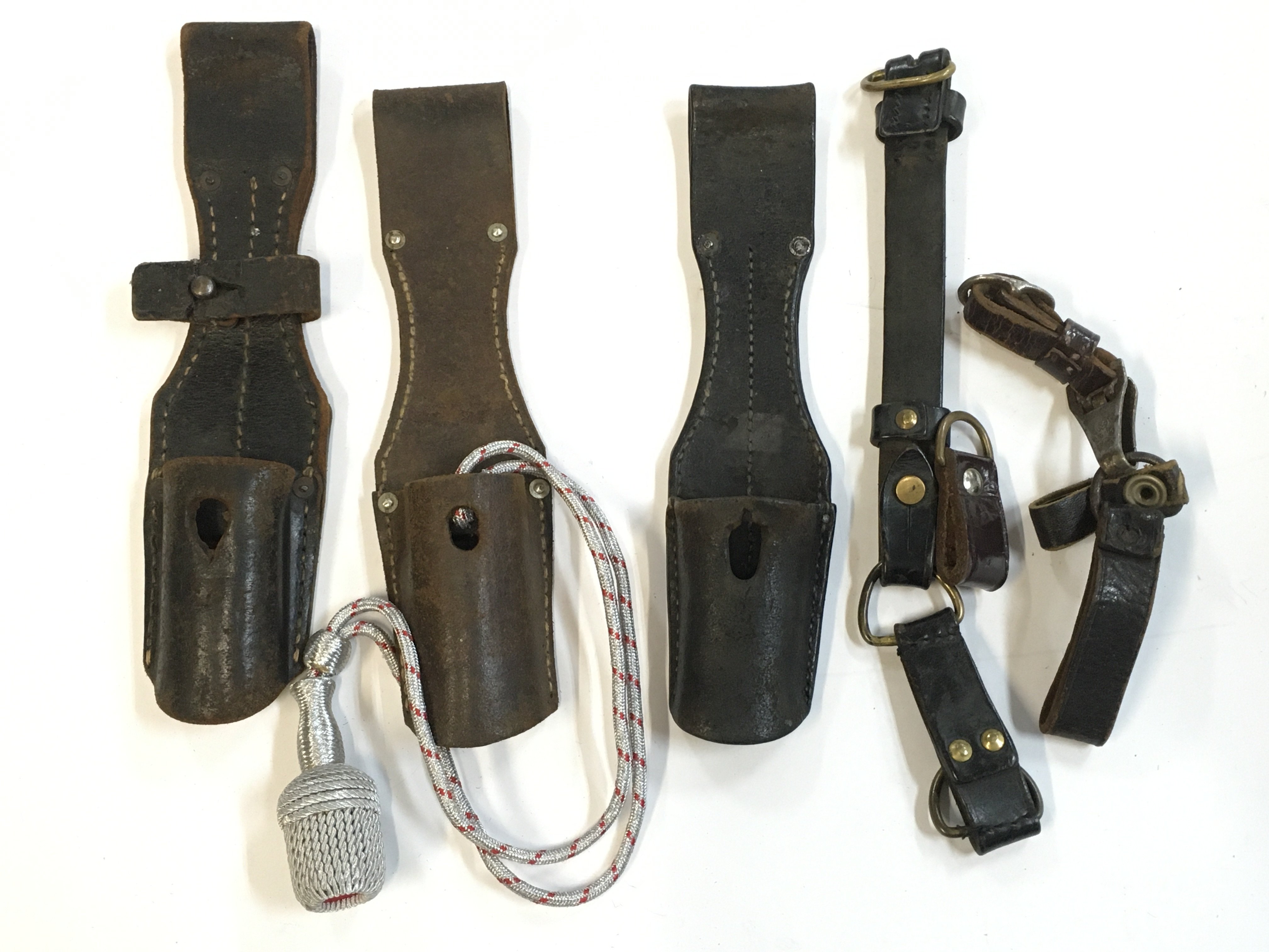 Three German k98 leather bayonet frogs , leather sword hanger, triple hanger and two belt loops, and a bullion dagger knot GC. Postage category B