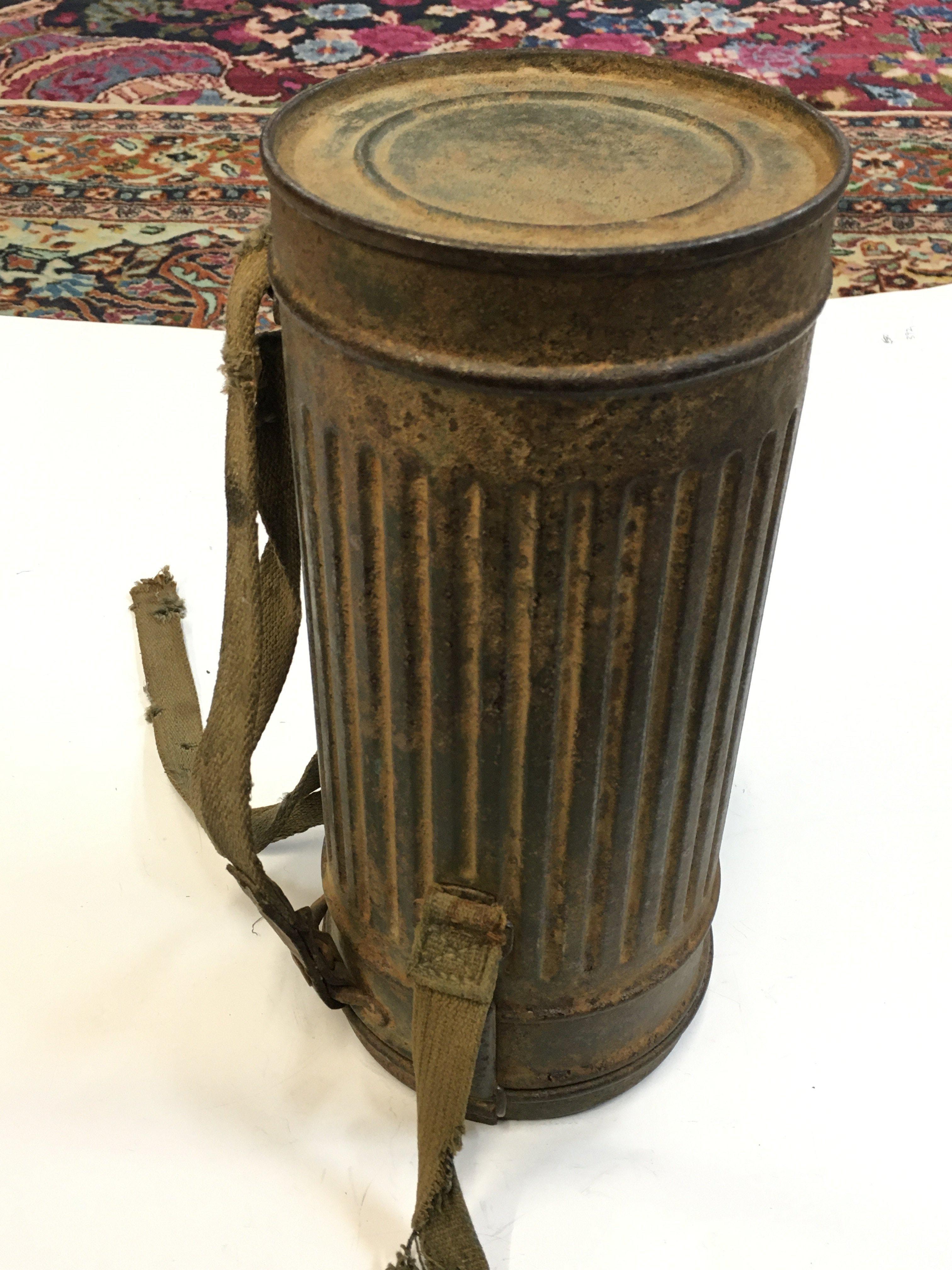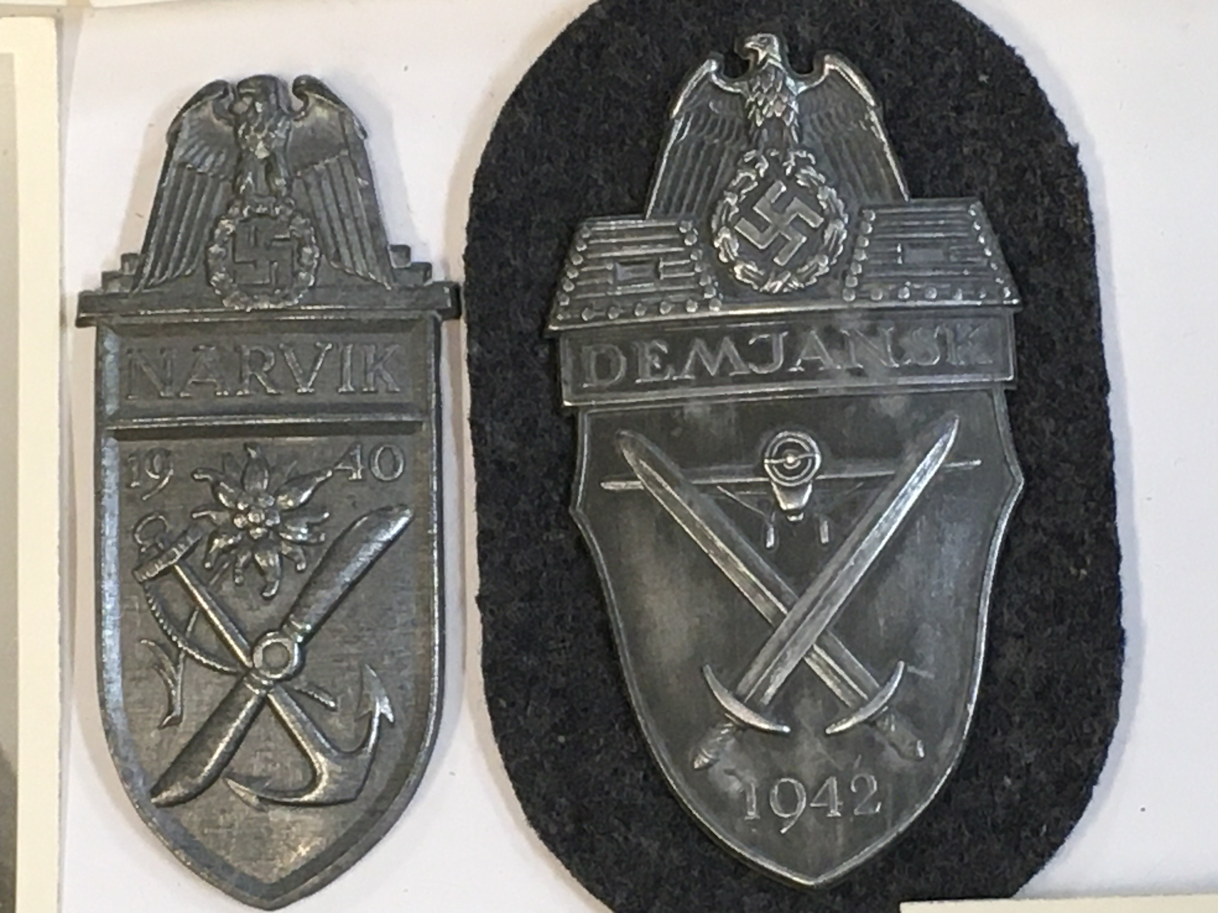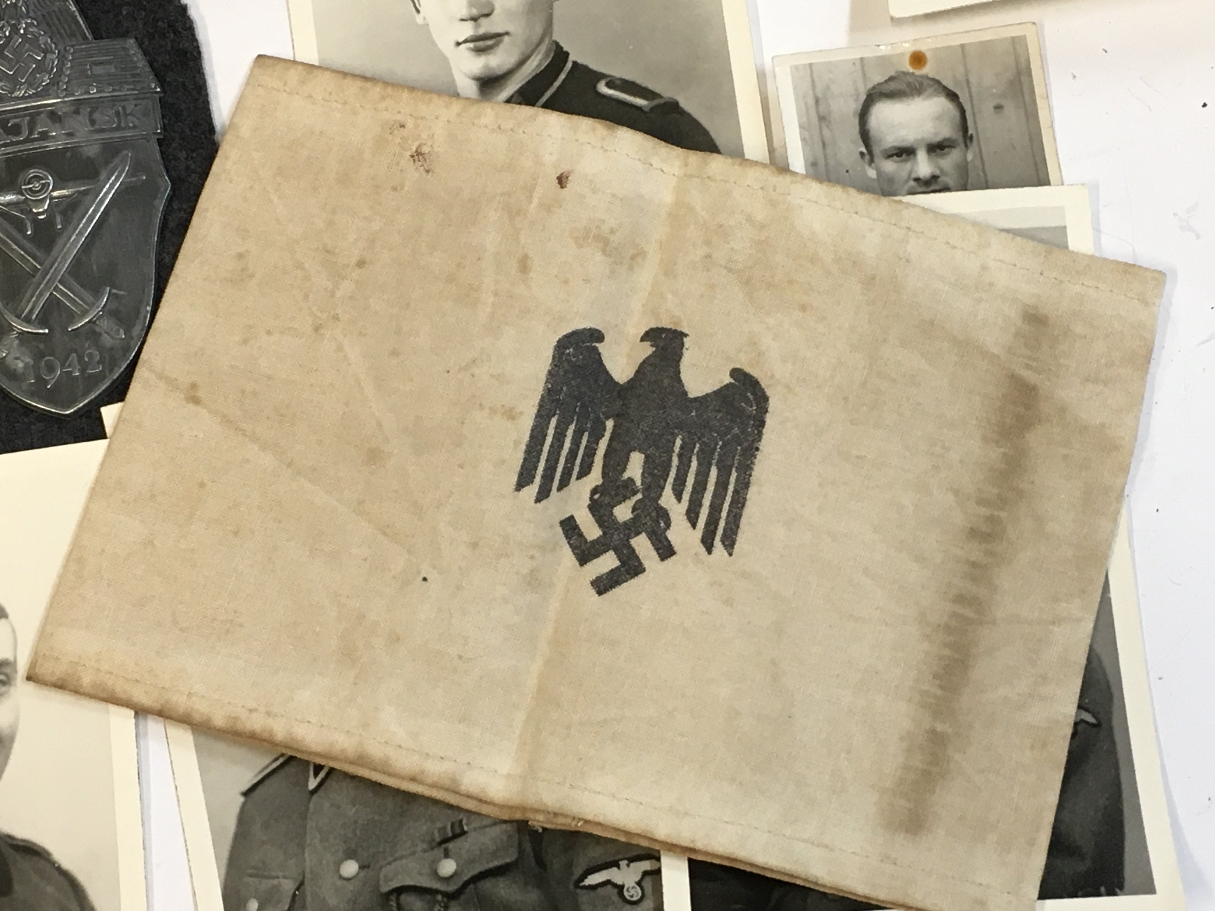 An assortment of German photos , German armband , Navrik arm shield, Demansk arm shield and a gas mask container .Postage cat a
