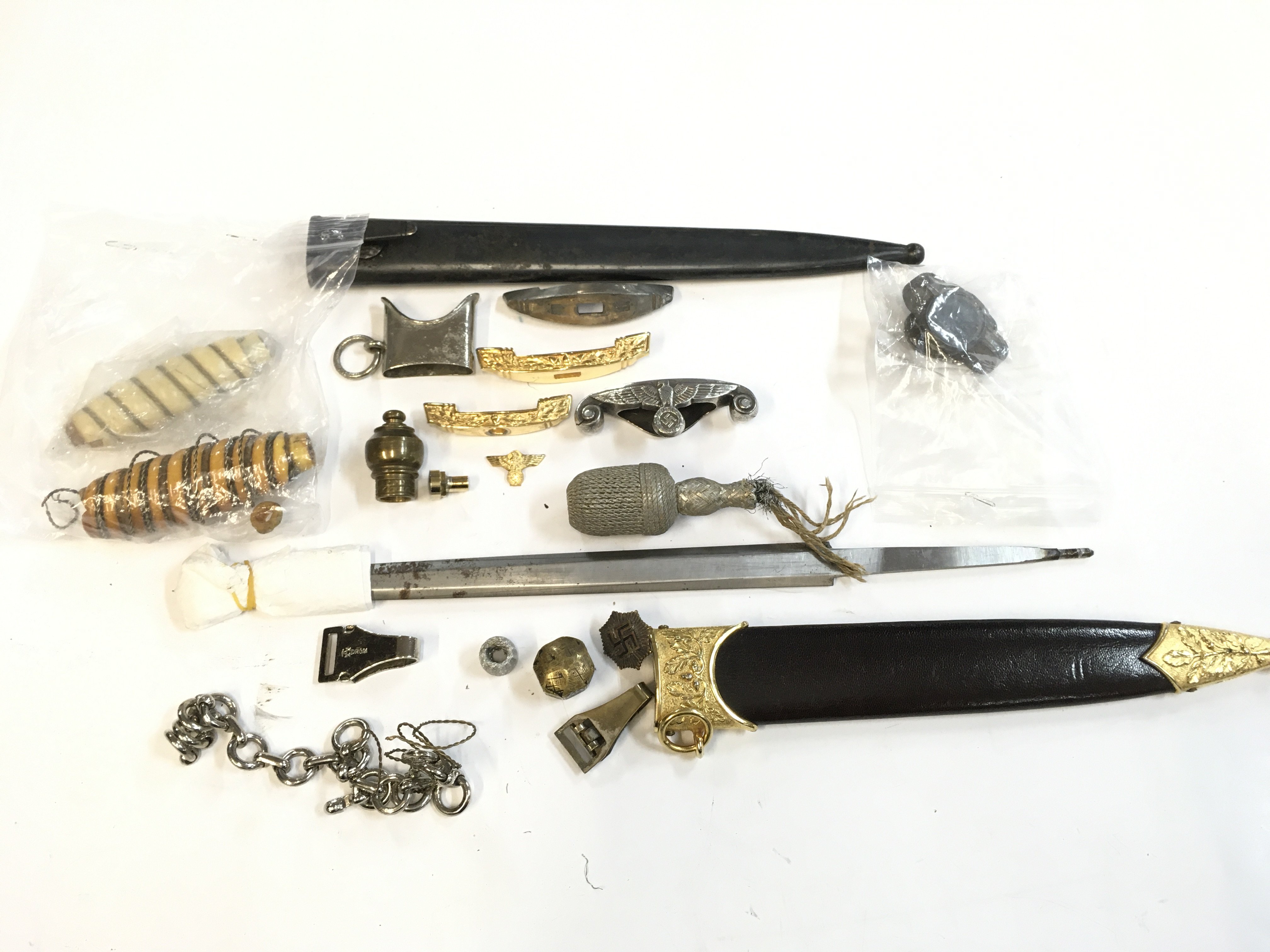 an assortment of WW2 nazi German dagger parts including naval and Luftwaffe grips, hanger clips, chain knot , army dagger blade etc. this lot cannot be posted