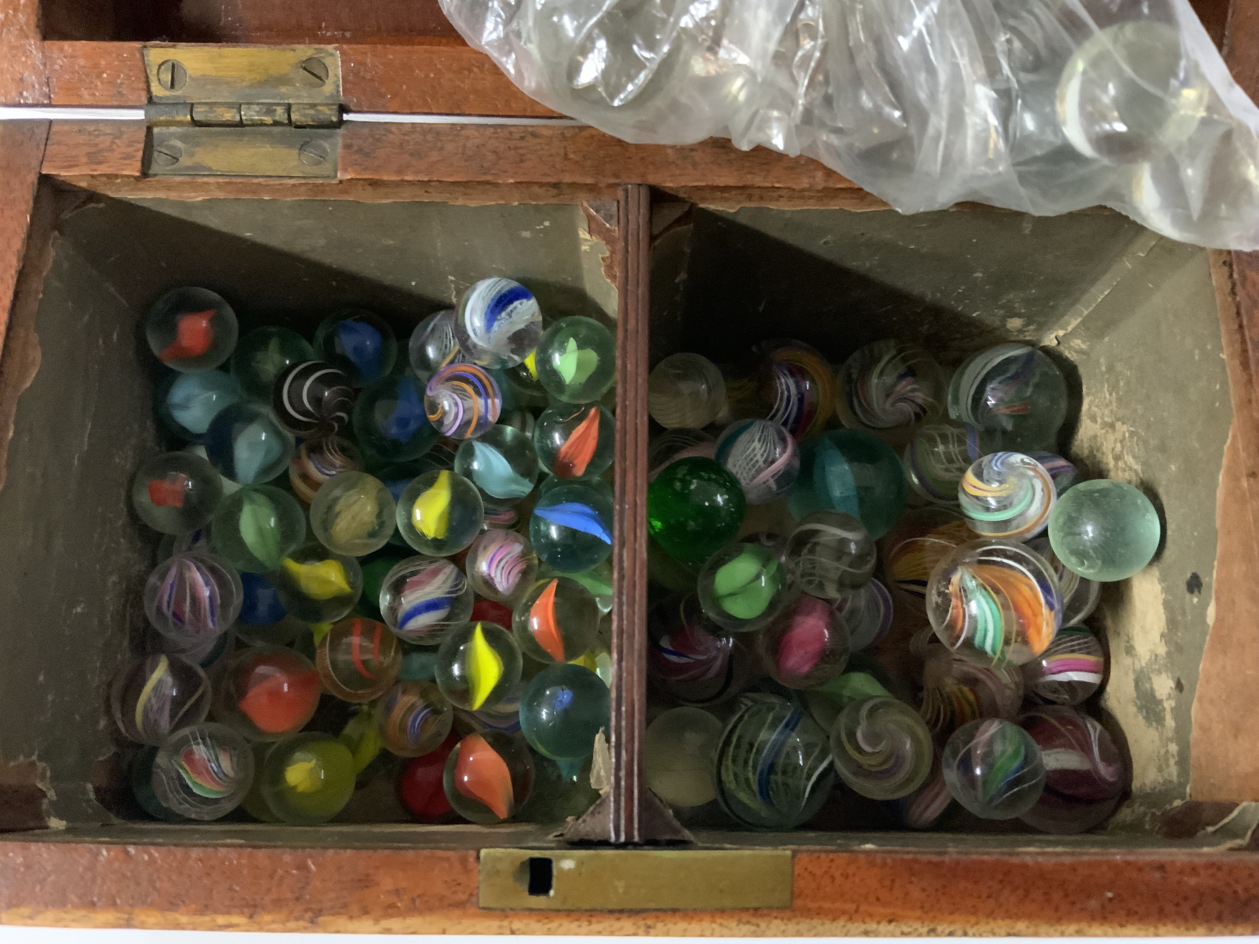 A small Victorian walnut tea caddy together with a mixed collection of vintage marbles.